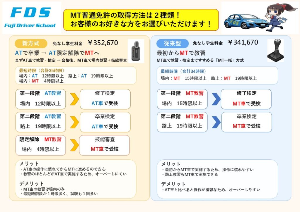 | 向いている方 | 安心して運転に慣れたい方 | MTでしっかり学びたい方 |